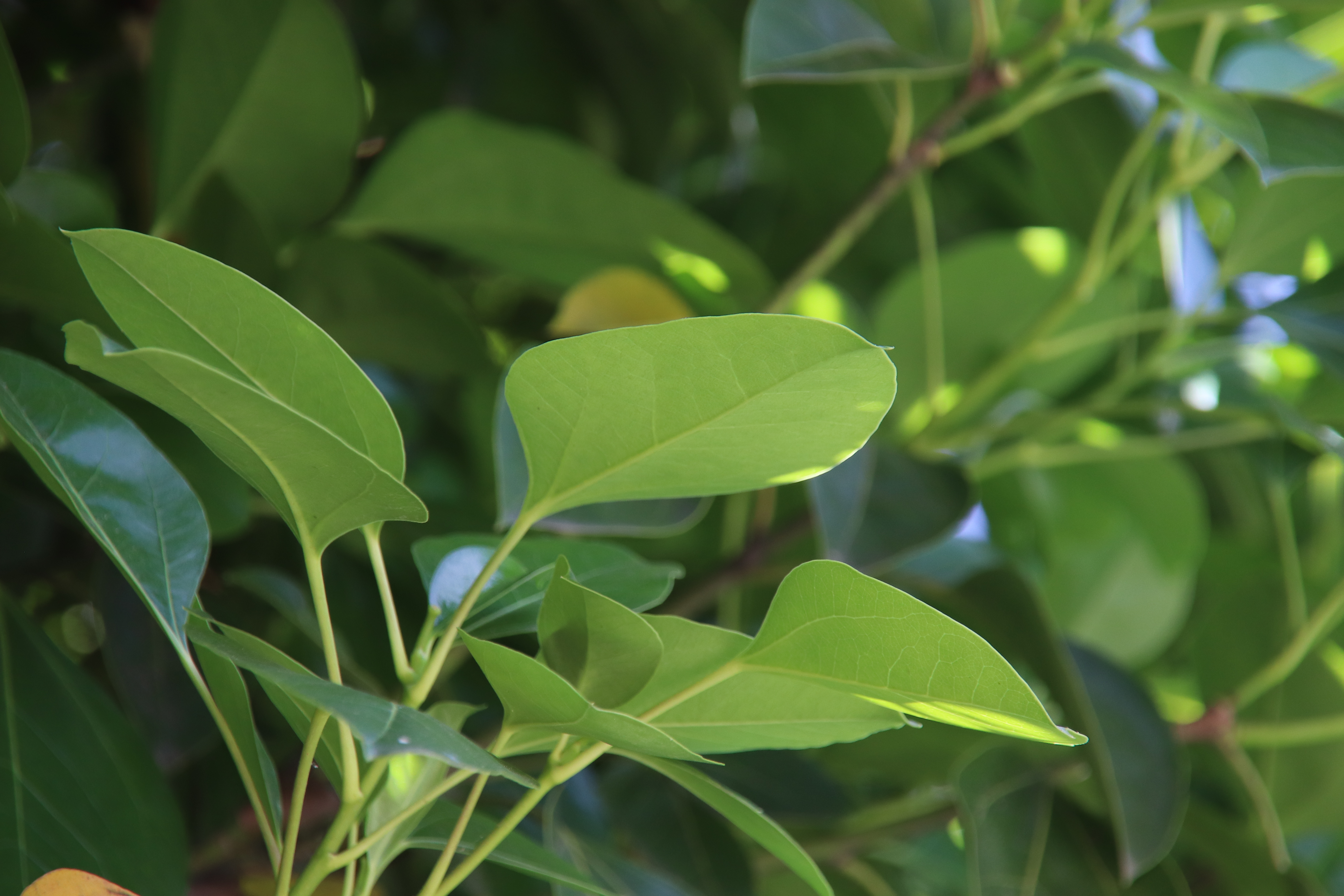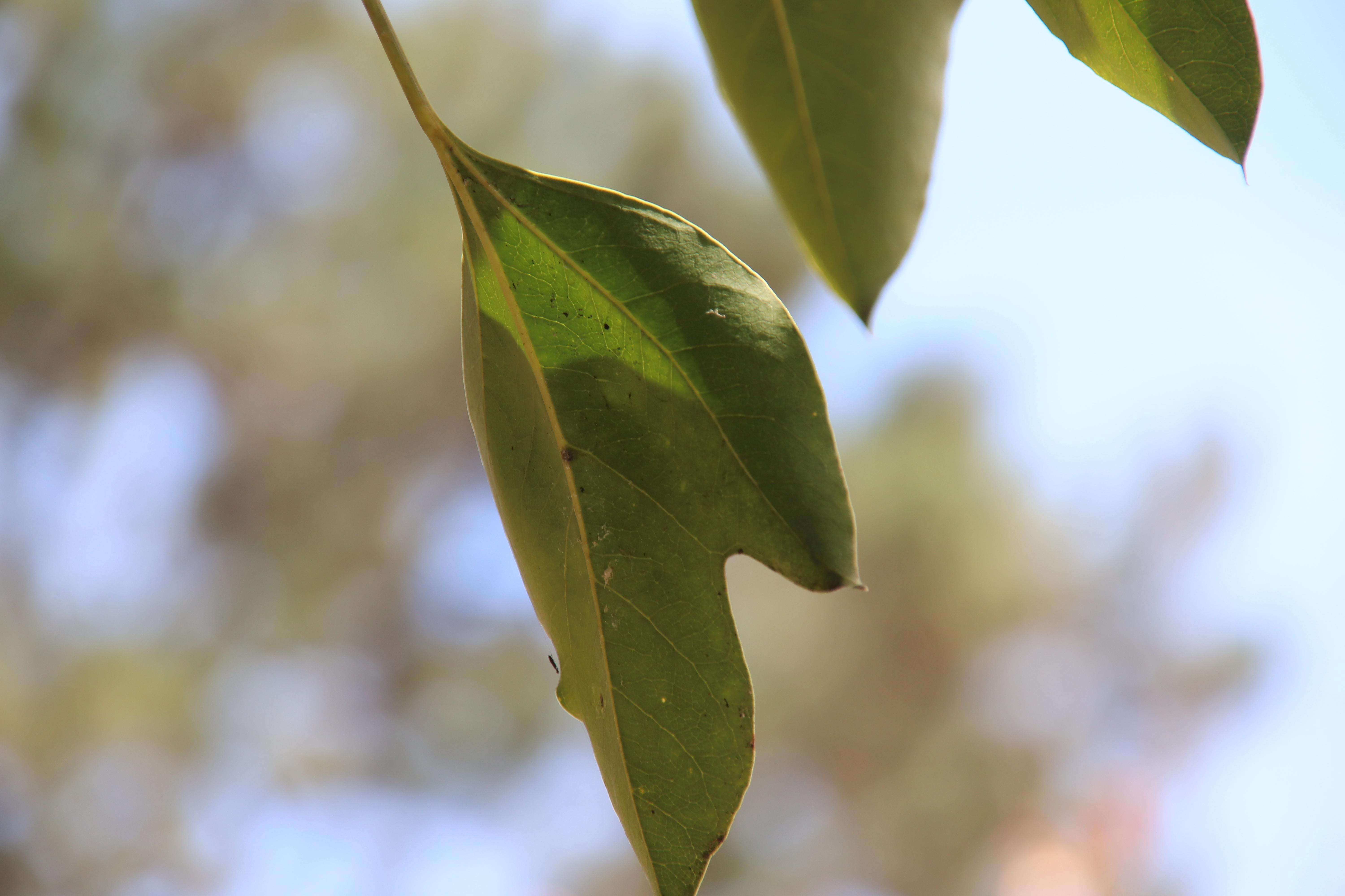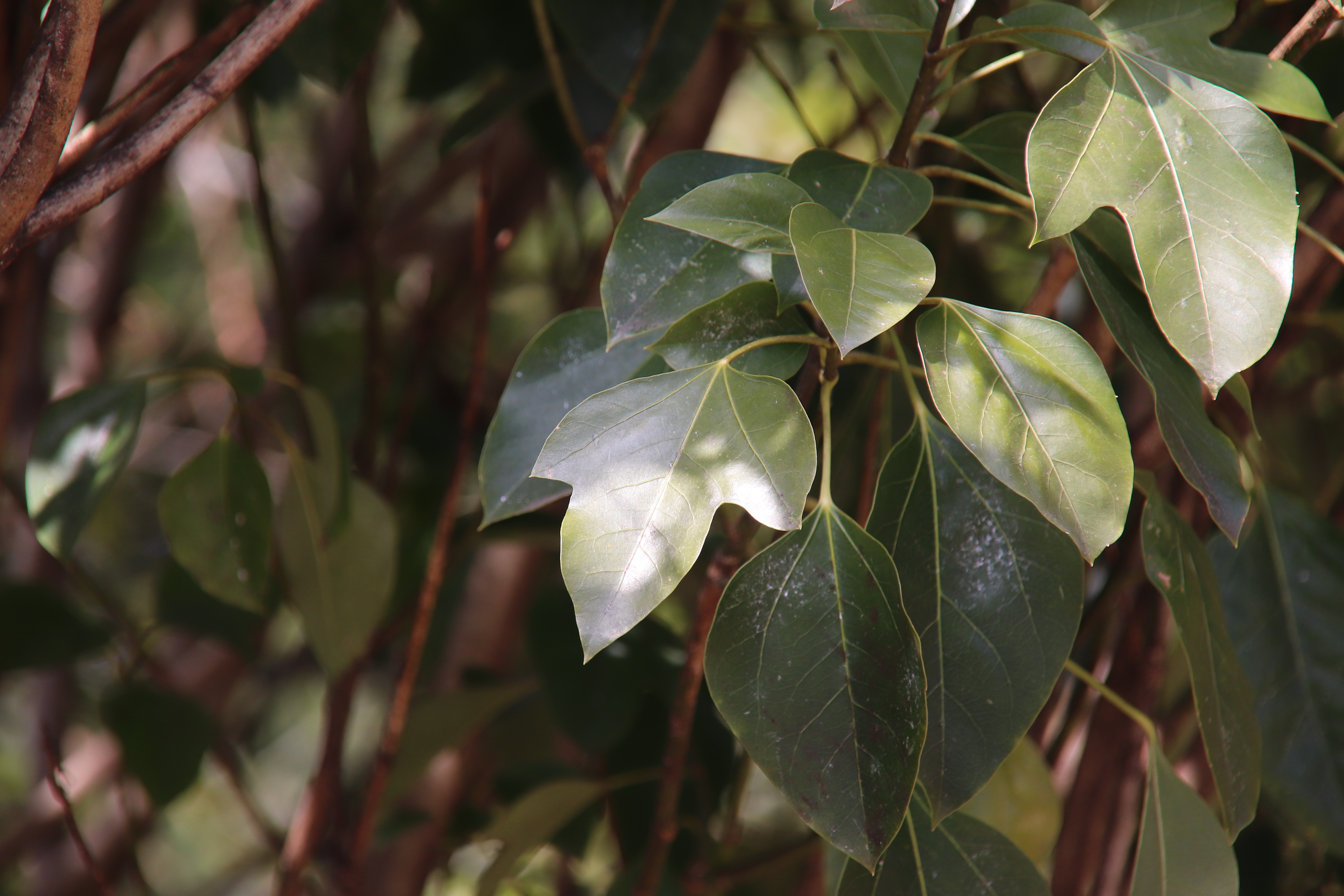 황칠나무 잎은 3~5갈래로 갈라지고 윤기가 나며 털이 없는데 전형적인 상록수 잎의 특징을 보여 준다.
