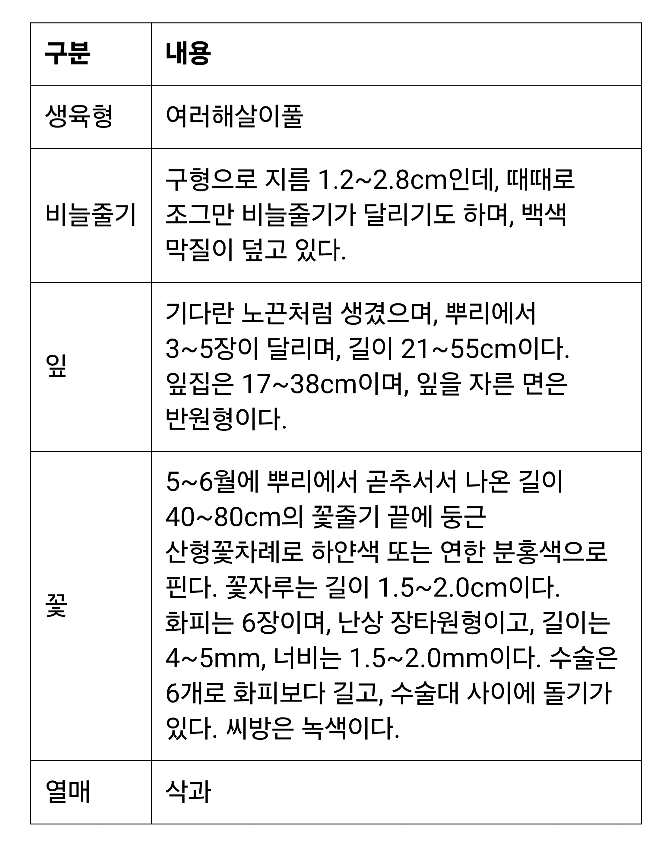 분류체계 : 피자식물문 > 백합강 > 백합목 > 백합과 > 부추속 > 산달래